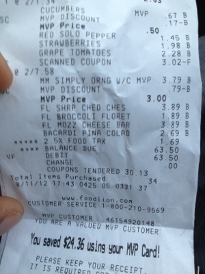 Couponing isn’t hard! Through the Sunday paper, we got a bunch of coupons, and printed some online as well. Kristin even took the time to write to some manufacturers – those were some of the best ones. So after taking the weekly grocer ads and combining those with some coupons, we ended up saving over a third of our grocery bill at Food Lion. That extra drink at Sharkeys last night seems to have paid for itself, in some very interesting way.